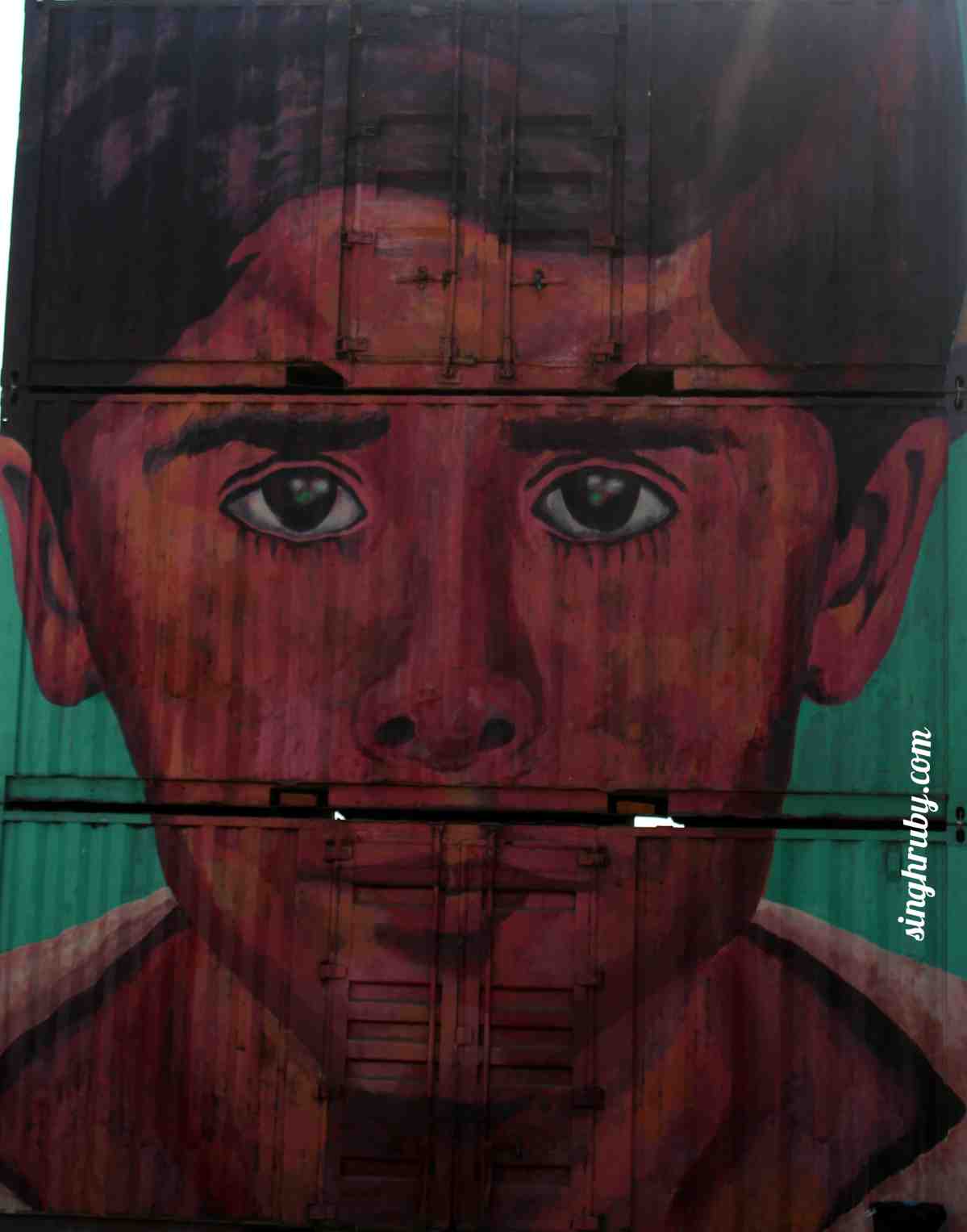 Creation of an Indian artist Harish Raman, this piece was titled as “Temple of Graffiti”. Like we believe that our God will protect us from all evil the idea behind this painting was that street art should be protected as well. This Sadhu is symbolic to God of Graffiti who is cool and chic like street art but yet conventional like Gods. Just below this container a temple is created which has another painting with the same saint blessing everyone with both hands and legs. He is symbolic to meditation, discipline and faith.
