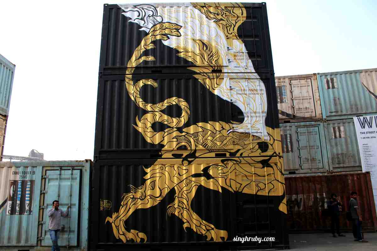 This piece was created by an Amsterdam based artist “Niels Shoe Meulman”. He is popular for revolutionizing the art of writing as he brought in the concept of Calligraffiti which is a fusion of Calligraphy and Graffiti. At WIP he had spread his magic across four huge containers in three layers. The first layer showcases the graffiti, the second depicts abstract art created with broom (made of natural materials) and the third layer was dedicated to Calligraffiti. He was intrigued by the Indian broom and he took some along back to Amsterdam.